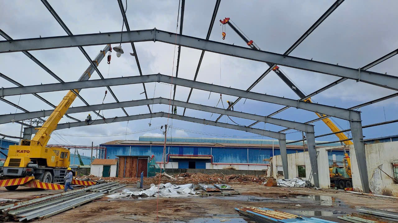 • Cấu tạo: Bao gồm cột, kèo, xà gồ được thiết kế tối ưu bằng thép hình I, H hoặc thép tổ hợp.